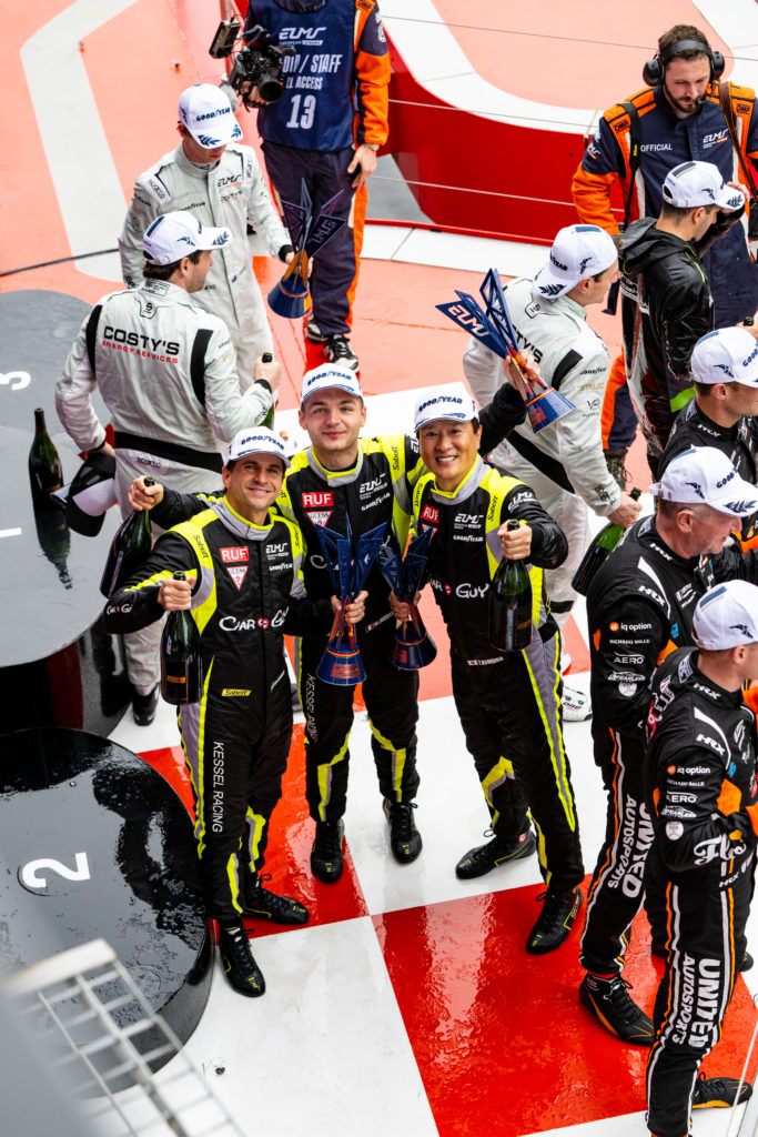 108周目、残り25分で50号車フェラーリを抜いて4番手に。122周目、ついに62号車メルセデスを捉えてターン10の外側から仕掛けて行き、ターン13の内側を取って巧みなオーバーテイクで3番手まで浮上。お互いフェアなバトルで見応えのあるレースでバルセロナサーキットの観客席の声援も沸き立った。チェッカーまで残り2周。ピットにいる誰もが祈るようにモニターを見つめる。そして見事3位のチェッカーを受けて開幕戦をポディウムで飾る事ができた。